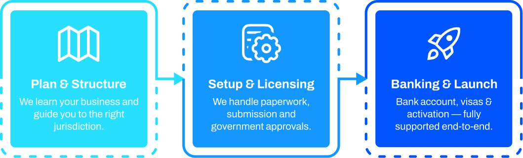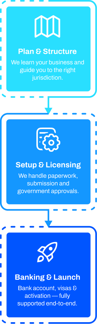 Formation, banking, visas, renewals and compliance handled with ongoing guidance.